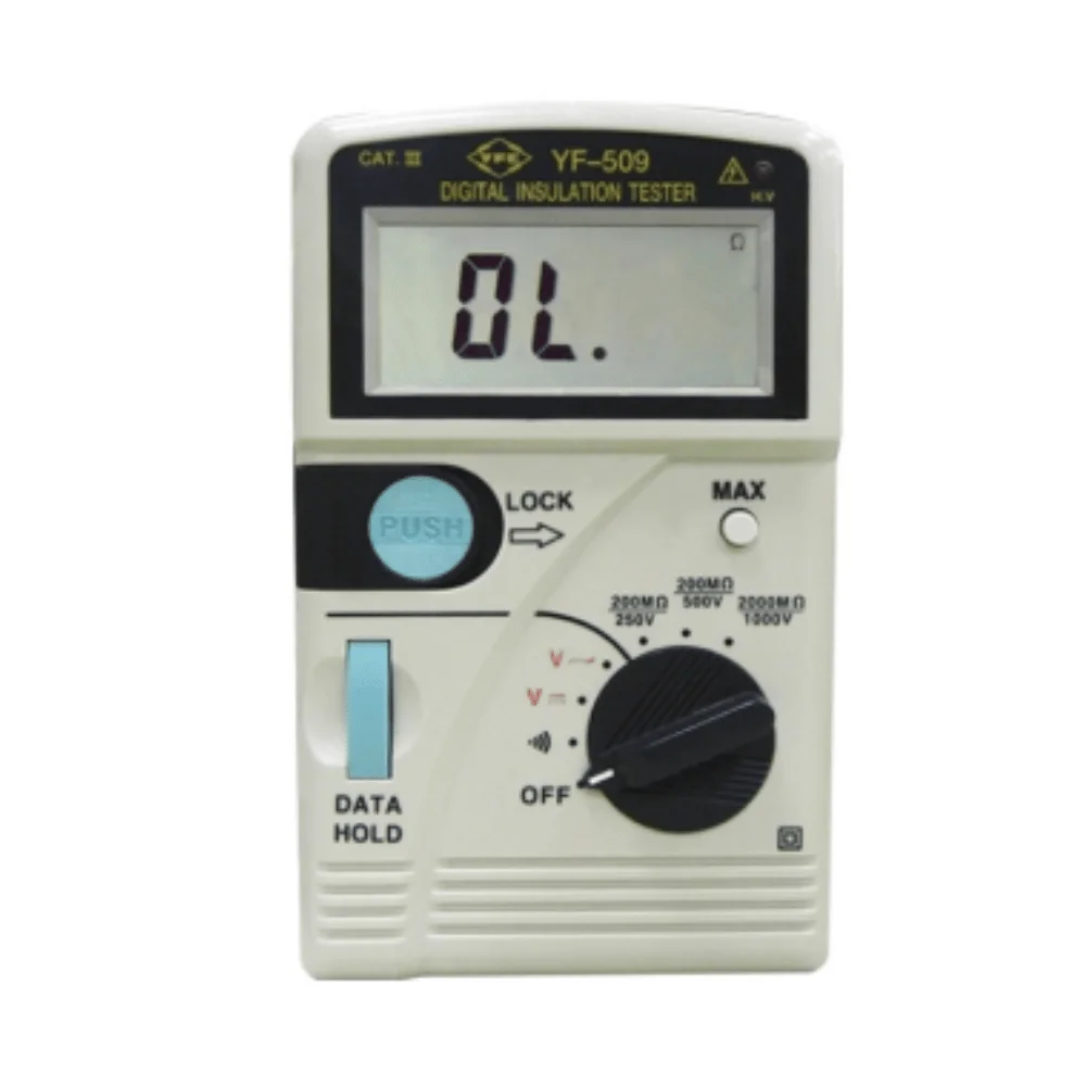 Đồng hồ đo điện trở cách điện Tenmars YF-509 với thiết kế đẹp, nhỏ gọn, dễ dàng sử dụng. Đây là thiết bị đo điện trở giá rẻ mà Tenmars hướng tới người dùng phổ thông. YF-509 tuy giá rẻ, nhưng vẫn có đầy đủ tính năng của một phép đo. Máy đo điện trở cách điện Tenmars YF-509 dùng để đo, kiểm tra điện trở cách điện trong các nhà máy, thiết bị điện tử, điện lực, than khoáng sản, viễn thông….
