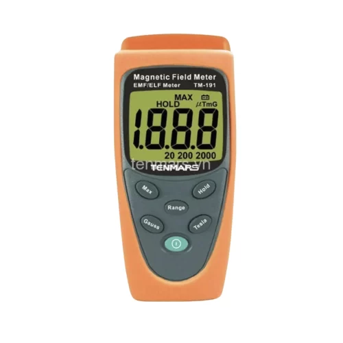 Máy đo điện từ trường Tenmars TM-191 là máy đo từ trường, máy đo phóng xạ dùng trong thí nghiệm, khoa học. Hay máy đo sóng điện từ, từ trường. Nó được ứng dụng đo điện từ trường vô cùng tiện lợi của Tenmars. Máy đo từ trường phát ra từ các trạm sóng điện thoại, lò vi sóng, tivi, tủ lạnh, máy tính,… Xác định được cường độ điện từ trường phát ra từ các thiết bị nhằm phòng ngừa hoặc tránh được sự nguy hiểm ảnh hưởng đến sức khỏe con người. Máy hiển thị bằng màn hình lớn rất dễ xem, chức năng đo chính là EMF/ELF với hai đơn vị là micro-Tesla và mini-Gauss. Tenmars TM-191 là thiết bị đo điện từ trường giá rẻ mà đầy đủ chức năng của một thiết bị đo cao cấp.